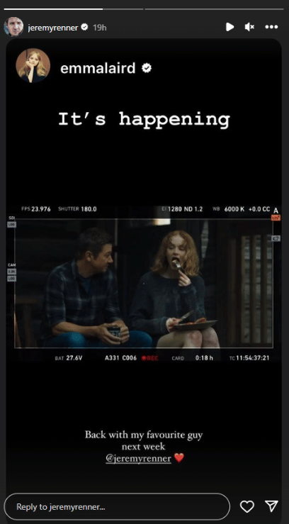 Jeremy Renner will be returning to work within the first week of January. The confirmation came in directly from the actor in a response to his Mayor of Kingstown co-star Emma Laird's cheerful Instagram story expressing excitement to be on set with him again. Laird's caption simply read "Back with my favourite guy next week @jeremyrenner" followed by a red heart emoticon.