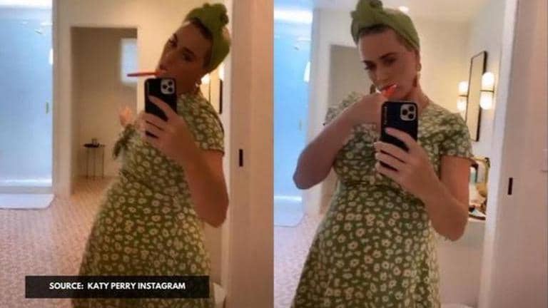 Katy Perry recently took to her Instagram profile to share a small video of herself. In the video, the singer can be seen grooving to the remix version of her own song, Daisies. Perry also flaunts her baby bump as she is seen dancing with a toothbrush in her mouth. The singer was seen in an olive green dotted dress with white daisy print and an olive knotted head wrap.