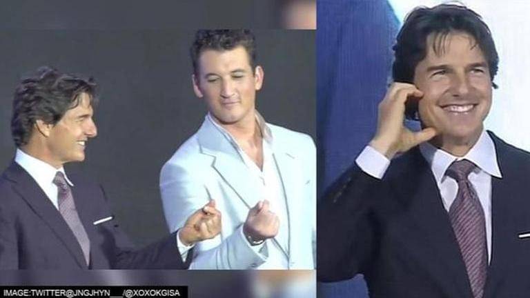 Earlier, the actor won over the people of Korea when he attempted the finger heart gesture, popularised by the stars of the nation. Now, a video is making the rounds on the internet of Cruise teaching his co-star Miles Teller to do the finger heart gesture.