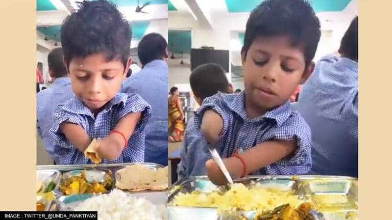 The viral video opens up to show a child enjoying his meal in school. It's only when the video progresses that one notices that his hands have been amputated from below the elbow.