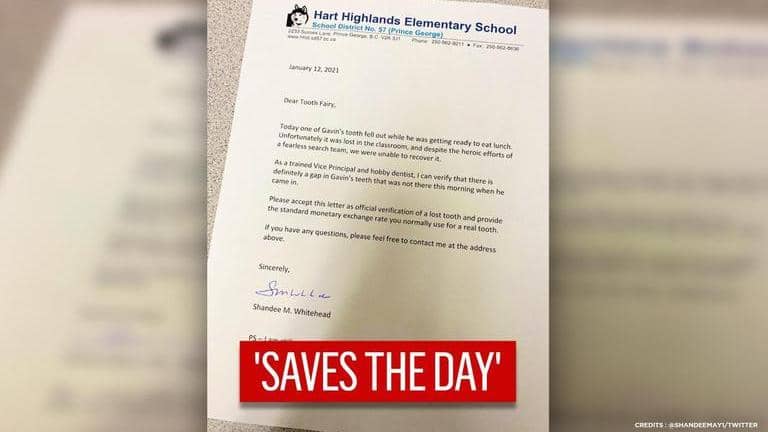 Sharing the letter, Vice Principle Whitehead wrote, In addition to contributing to a long-term plan for ST success, improving school leadership amongst other things,  a VP has the duty of helping to create a positive school culture ... one that saves the day!. In the letter, the Whitehead narrates the incident writing that Gavin was about to eat his lunch when he lost his milk teeth and despite “heroic efforts” could not find it. The few following lines go on to say that as vice-principal Whitehead verifies that the incident is true and Tooth Fairy should give Gavin “the standard monetary exchange rate that is normally used for a real tooth.” She ends the letter with witty postscript wherein she jokingly reckons that she was still waiting for the money for her wisdom teeth that she got in 2000. “Please pay as soon as possible. I have bills to pay,” she wrote.