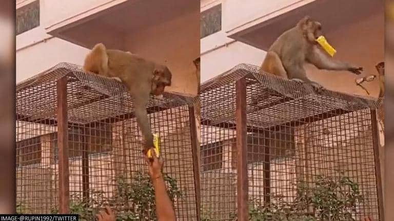 The video was posted on Twitter alongside the caption, "Smart Ek haath do, Ek haath lo." In the video shared on the microblogging site, a monkey can be seen sitting atop a cage holding a pair of spectacles. The man in the video offers a pack of juice to the monkey and as soon as the monkey reached for it, the person refused to let go of it. After a few moments, the man gave him a pack of juice and the monkey too gave him his spectacles back. The spectacles got stuck in the cage, however, the monkey pushed them down, giving them to the person. Watch the video here:
