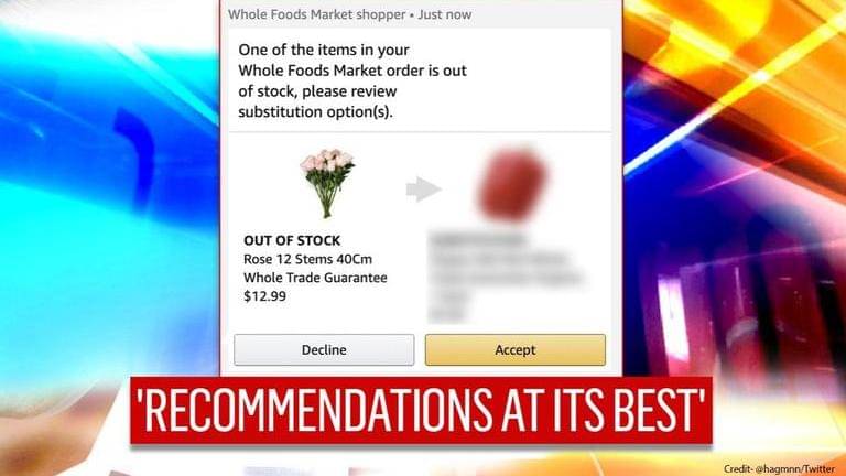 “One of the items in your Whole Foods Market order is out of stock, please review substitute option(s)”, says the screenshotted image that has been uploaded. Below in the options it shows the ‘Rose 12 Stems, 40cms Whole Trade Guarantee’ that are priced at $12.99, being substituted by a red bell pepper which has been described as, ‘Pepper bell red Whole Trade Guarantee organic’. One piece of the red bell pepper has been priced at $3.99. Right below it is an option to accept or decline the substitute option.