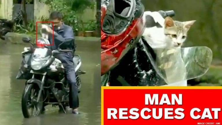 According to media reports, a man riding motorcycle saved the life of a feline, while the cat was suffering in floods and took cat his home to care. A video shared by news agency ANI shows kitten sitting on the motorcycle and being taken by the motorcycle rider. ā€œA local in Wadala area of #Mumbai carries a kitten on his motorcycle after rescuing it, amid heavy rainfall in the city. He says, ā€œI am taking the kitten home,ā€ ANI tweeted
