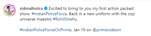 Sidharth, who is making his digital debut with Indian Police Force also shared on his Instagram handle and captioned it as "Excited to bring to you my first action-packed show, #IndianPoliceForce. Back in a new uniform with the cop universe maestro #RohitShetty.