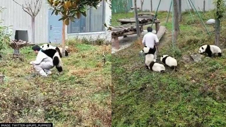 It is a common sight to see videos of animals going viral on social media. The posts involving the adorable, goofy or fun-filled antics of the creatures like dogs, cats and other creatures have a massive fan following. One such video doing the rounds on the internet features pandas having an enjoyable time with their caretaker.