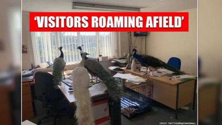 Photos of peacocks lazying around in empty office spaces wins the internet; See pic
