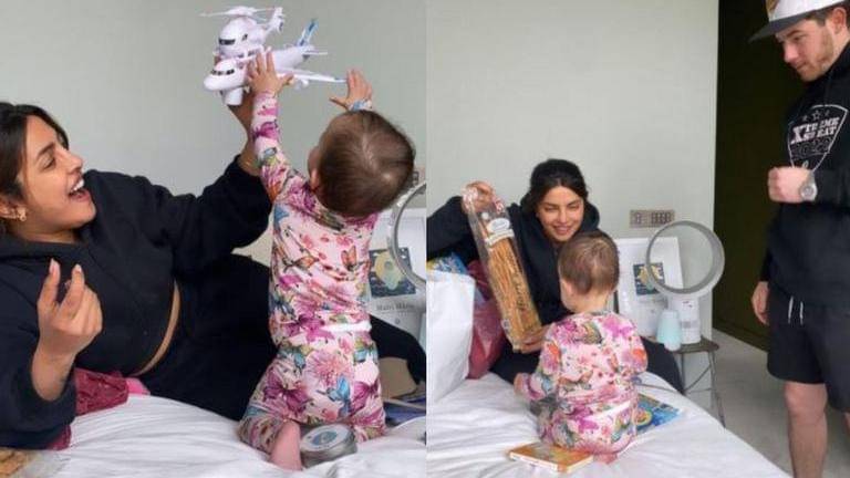 Priyanka took to social media and shared a series of photos. In the first photo, she can be seen playing with Malti Marie. While the actress sported a black sweatshirt teamed with matching joggers, the little munchkin looked cute in a floral night suit. They were seen enjoying themselves while playing with an airplane.