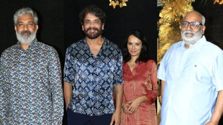 Ram Charan is celebrating his 38th birthday today. To mark the occasion, the actor is hosting a party for his friends and family members in Hyderabad. The first ones to arrive at the actor's party are RRR filmmaker SS Rajamouli and actor Nagarjuna. The veteran actor was accompanied by his son Naga Chaitanya and other family members. Oscar-winning music composer MM Keeravaani too was spotted at the venue. Naatu Naatu singer Rahul Sipligunj also arrived at the party. They were all mostly dressed in casual outfits. Check out their photos from the party below: