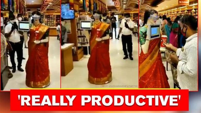 A user shared video of robots dressed in saree moving around in a textile showroom in Tamil Nadu to detect the customers and provide them with hand sanitizers.