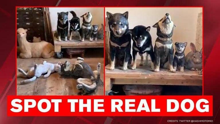 Netizens find the real dog among wooden carved canines in video, call him 'poser'