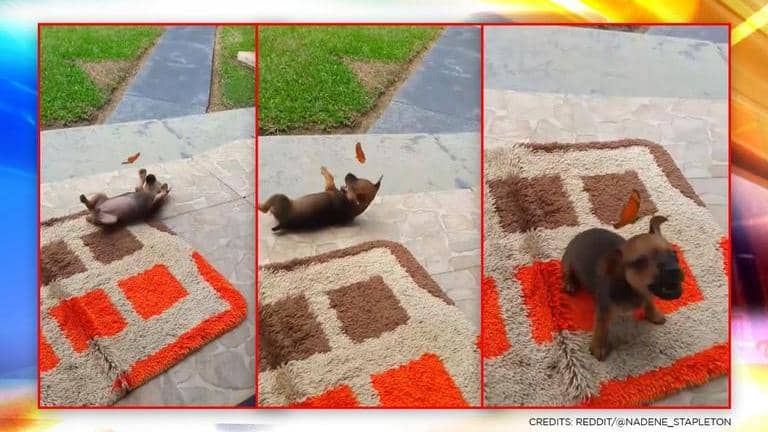 'Straight out of a Disney movie': Puppy and butterfly delightfully play at house porch