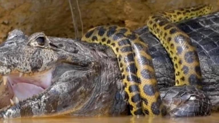 Showing an intense fight for survival, a video is going viral on the internet showing a giant green anaconda wrapping itself around a Caiman, a sub-species of alligator, in Brazil. The crocodile in the viral video could be seen struggling to save his life as the giant snake kept constricting it.