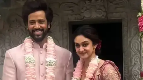 In the viral photos, Aishwarya and Umapathy can be seen twinning in soft pink ensembles. The 31-year-old actress can be seen in a silk saree paired with a quarter-sleeved embellished blouse. Umapathy, on the other hand, is donning a sherwani featuring golden embroidered on the sleeves. They both can be seen wearing garlands as they pose for the picture.