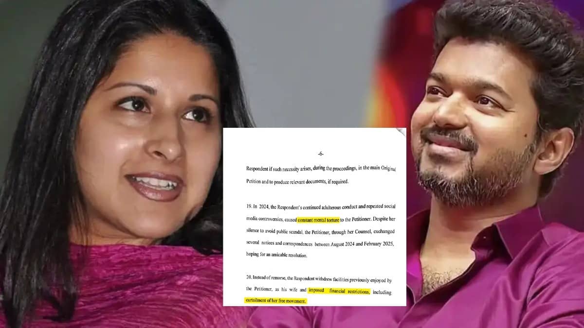 Tamilaga Vettri Kazhagam (TVK) chief and actor Vijay's wife Sankgeetha has filed a petition for divorce against him in the Chengalpattu family court in Chennai. This comes amid reports that Sankgeetha has been living separately from her husband. As per the divorce petition, Sankgeetha has accused Vijay of infidelity, alleging that he has had an "adulterous relationship" with an actress. As per the court documents, Vijay's alleged affair was discovered by his wife in 2021. Despite assurances, he continued to associate with the "actress" in public, at events and in movies and this led to a strain in his marital life.