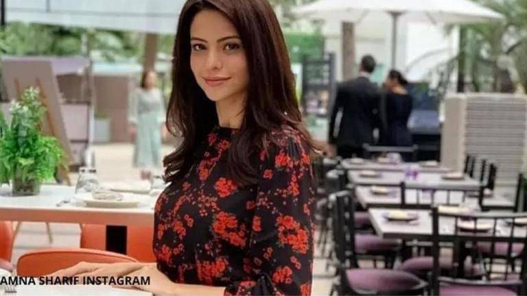 In this picture, Aamna Sharif can be seen with her husband wearing a white shirt blouse. Aamna has left her hair open with a side parting and has paired them up with beige coloured shorts. She can be seen carrying a sling bag and a matching wristwatch with her outfit. Her husband is wearing a blue coloured sweat jacket with a pair of denim.
