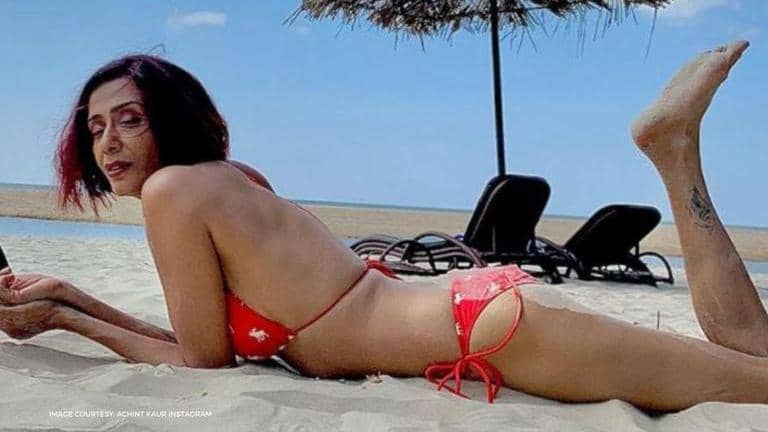 Actor Achint Kaur recently took to Instagram to share stunning pictures of herself from the beaches of Goa, where she has been working on the show Jamai 2.0. In the pictures shared, she is seen dressed in a simple yet stylish two-piece bikini set. The actor is seen lying on the clean sand while looking ahead with smouldering eyes. In the second picture, she was also spotted looking at the camera with intense expressions while holding one of her legs up, to pose.