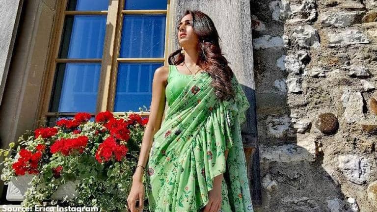 Erica is wearing a green colour lehenga with a golden and red mirror design. Her outfit here is designed by Jiya By Veer Design. She wore this attire for one of her friends' wedding in Jaipur. Take a look at her outfit.
