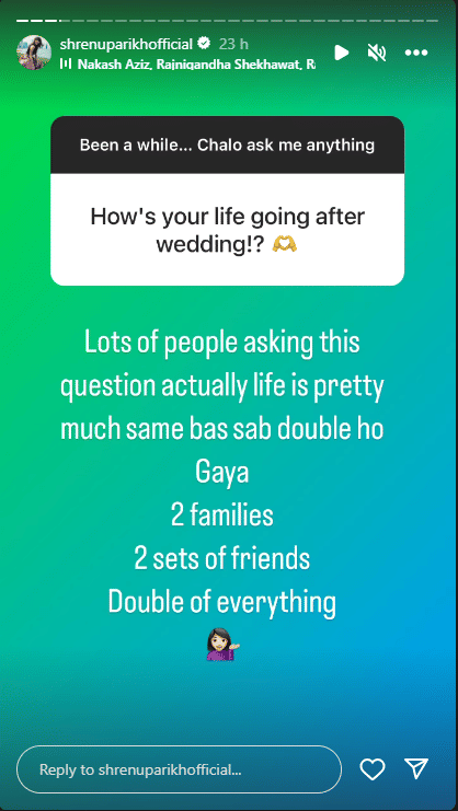 The actress held an Ask Me Anything session with her fans on Instagram on Sunday, and a user asked the Maitree fame actress how’s her life going after the wedding. To this, Shrenu responded, “Lots of people asking this question actually life is pretty much the same bas sab double ho Gaya 2 families 2 sets of friends Double of everything.”