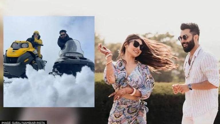 Suraj Nambiar and Mouni Roy go snow-biking on their Honeymoon
