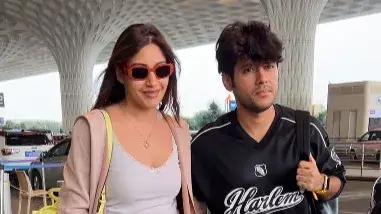 Surbhi Chandna and Karan Sharma were snapped at Mumbai airport. The actress sported a beige top teamed with brown leather pants and a pink trench coat. She completed her look with brown thigh-high boots. Her beau, on the other hand, kept her look casual in a black T-shirt teamed with blue baggy jeans and a cool pair of sneakers.