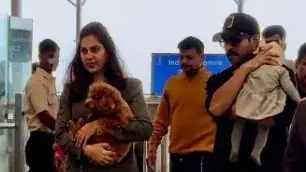 Telugu star Ram Charan and his Upasana were recently spotted at Hyderabad airport. The celebrity couple were seen with their little daughter Klinkaara. While Ram Charan spotted a casual black short Kurta and a cap, Upaasana was dressed in a grey overcoat with denims. The couple was also holding their pet dog Rhyme as they walked in the airport. The family is reportedly setting off to Bengaluru for Sankranthi celebrations.