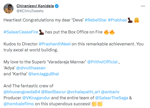 "Heartiest Congratulations my dear ‘Deva’ #RebelStar #Prabhas. #SalaarCeaseFire has put the Box Office on Fire. Kudos to Director #PrashanthNeel on this remarkable achievement. You truly excel at world building. My love to the Superb ‘Varadaraja Mannar’ @PrithviOfficial, ‘Adya’ @shrutihaasan and ‘Kartha’ @IamJagguBhai And The fantastic crew of @bhuvangowda84 @RaviBasrur @vchalapathi_art @anbariv. Producer and the entire team of Salaar on this stupendous success!" read the caption.