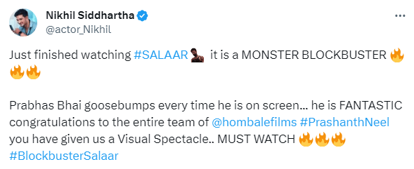 "Just finished watching #SALAAR it is a MONSTER BLOCKBUSTER. Prabhas Bhai goosebumps every time he is on screen... he is FANTASTIC congratulations to the entire team of @hombalefilms #PrashanthNeel you have given us a Visual Spectacle... MUST WATCH #BlockbusterSalaar," read the caption.