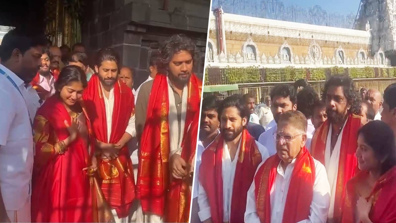 Actors Naga Chaitanya and Sai Pallavi, along with the film's director Chandoo Mondeti and producer Allu Aravind, visited the famous Tirupati temple on Thursday to seek blessings from Lord Venkateswara for their latest film, Thandel, which had a massive opening at the box office. A large crowd gathered at the temple, hoping to catch a glimpse of their favourite stars.