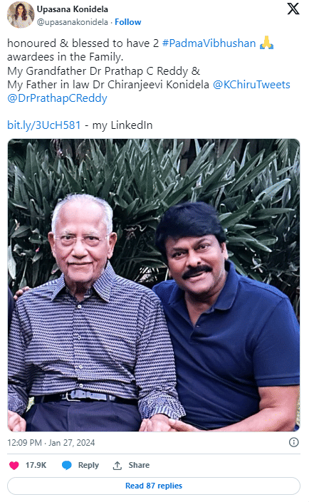Earlier last month, Upasana took to her official X handle to share a picture of her father-in-law Chiranjeevi, seated along side her grandfather, Prathap C Reddy. The common link between the two is that they are both Padma Vibhushan awardees. Appreciating the fact that she now has two Padma awardees in her family, Upasana penned a proud caption which read, "honoured & blessed to have 2 #PadmaVibhushan awardees in the Family. My Grandfather Dr Prathap C Reddy & My Father in law Dr Chiranjeevi Konidela @KChiruTweets @DrPrathapCReddy"