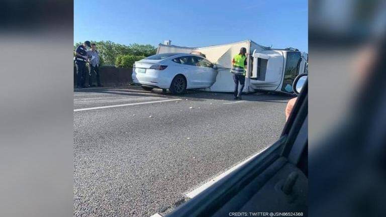 A surveillance video of a Tesla car colliding into an overturned truck in Taiwan is doing rounds on social media. In the video, one can see a Tesla Model 3 car coming in at full speed before colliding into the truck that was lying overturned on the road. According to reports, the driver of Tesla has alleged that that the car was running on autopilot mode before it slammed into the truck. The car was reportedly travelling at 110 kilometres per hour before hitting the truck and the driver has said that he tried applying brakes but it was too late.