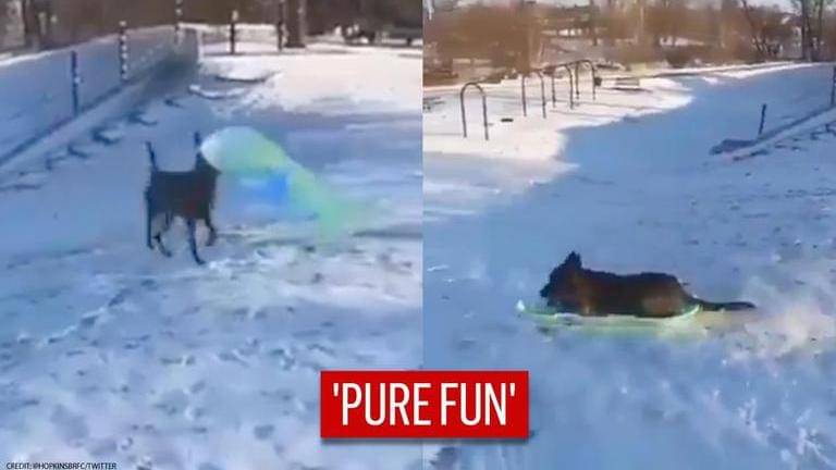 A video of an ecstatic pooch playing in the snow as he frolics and jumps while snowboarding has left the internet exhilarated. The nearly 15 seconds footage was shared on Twitter by a user Simon Hopkins who wrote in the caption that the canine’s gleeful winter experience is “the best” one will watch on the internet. In the footage that has amassed close to 12.2k views, the happy four-legged canine was seen cooped on a green snowboard that he fetched in his mouth, excitedly, as he descends a snow-covered slope with his tails streaming.