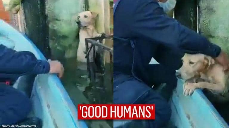 The yellow Labrador is seen taking support from a railing attached to a building as a rescue boat going through the neighbourhood spots it. Upon seeing the rescuers coming to his aid, the dog can be seen moving his paws to the side of the boat as a man gently lifted him to safety. The video was shared by American basketball played Rex Chapman, who called the rescuers "heroes".