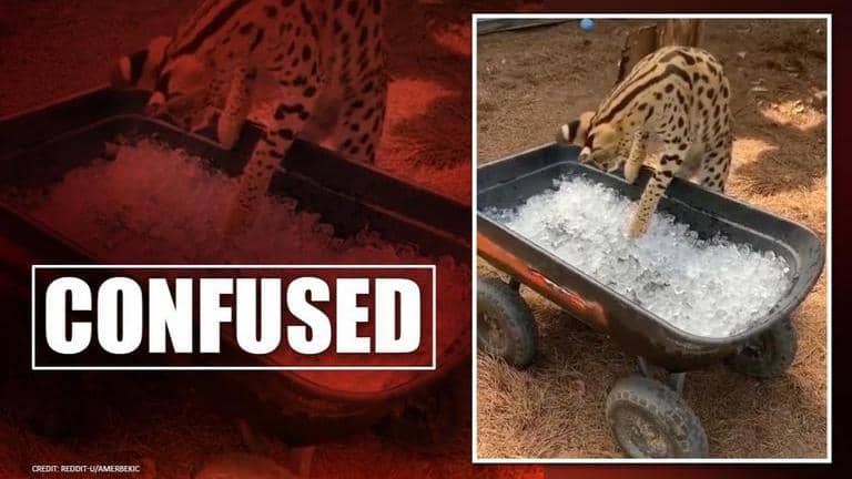 A 11-second long video is doing rounds on the internet which shows an African Serval at Orlando, Florida blown away by the coolness of the ice stored in a small carry wagon. The rare video was posted on Reddit by a user AmerBekic. The post has managed to garner more than 47,800 upvotes and 324 comments. Through the video, the wild cat be seen climbing up the small carry wagon and initially touches the cool surface and shockingly expresses its feelings through its whole body. The serval can be seen notwithstanding its cool while touching ice for the first time. In the video, the cat stands up on two feet to inspect the substance by punching it.
