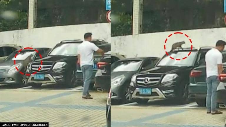 The viral video opens up to show the cat jumping on the bonnet of a car and then on the roof. From there, it tried to scale a wall but failed. Watch.