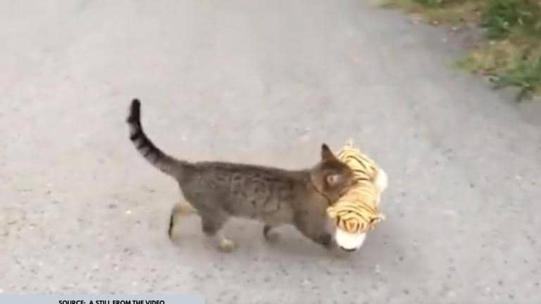 Cat walks away with stuffed toy 'borrowed' from neighbour, video goes viral; See here