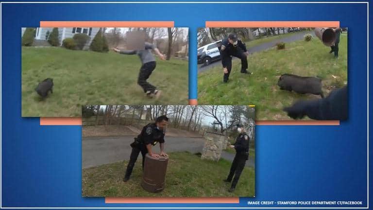 Stamford police department took to its Facebook handle to share a short clip of the incident where cops can be seen running after the pig to capture it.