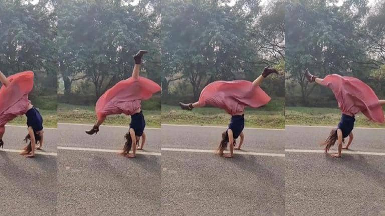 It is not the usual cartwheel one might see wearing athletic clothes but in a flush pink ankle-length skirt and pointy-toe black boots. The slo-mo cartwheel reel seen in the video was uploaded by national medalist gymnast Parul Arora, who has over 242K followers on Instagram. The caption to the successful and confident flip was all the more attention-grabbing. "High heels," she wrote on the post with two emojis to complete it. Watch the viral video here: