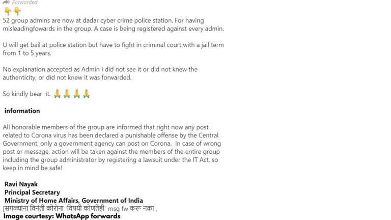 - The message states that the 52 WhatsApp group admins are detained at Dadar’s cybercrime police station for forwarding misleading information to their groups.