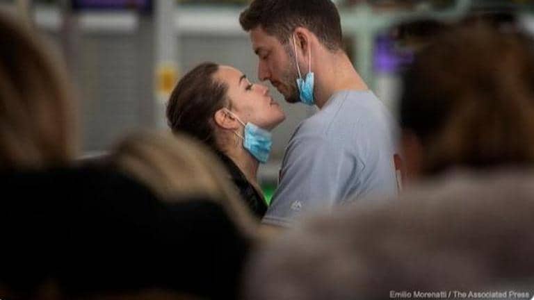 - However, the actual picture that is being shared is not of an Italian doctor couple, but a picture clicked by photographer Emilio Morenatti for AP (Associated Press) at Spain's Barcelona Airport. The photographer had clicked a pic of a couple kissing at the Barcelona airport when US President Donald Trump announced some restrictive rules about foreign travels from Europe.