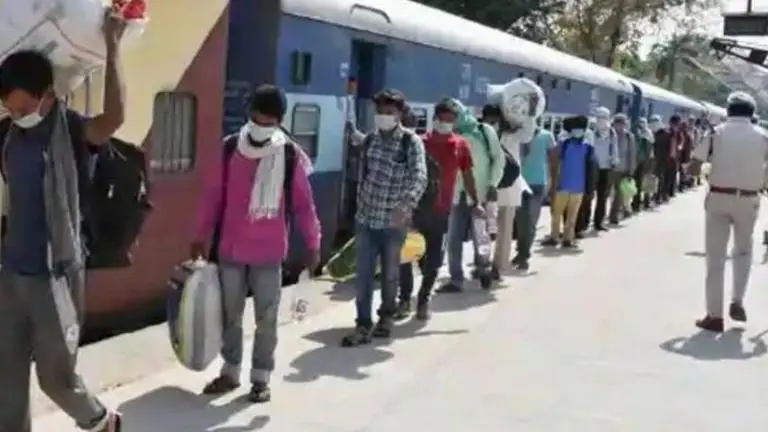 Crowds of migrant workers waiting to board trains in Mumbai