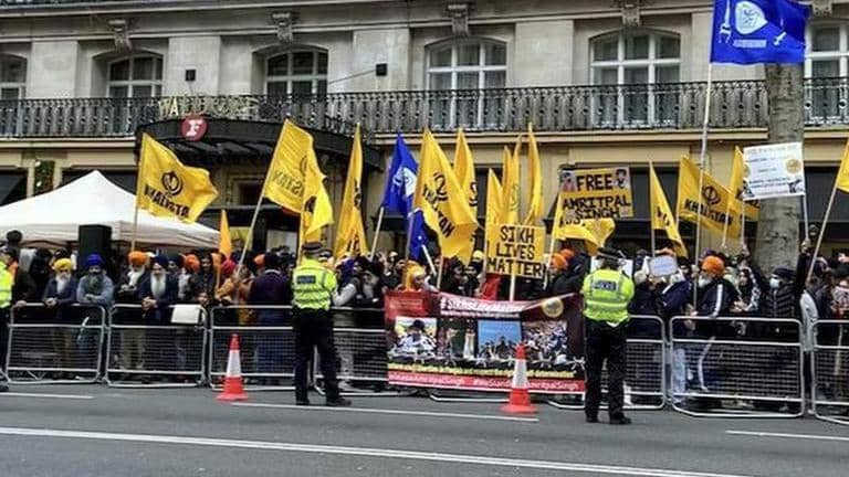 Pro-Khalistan protestors lined up outside the Indian Embassy in London. (Image: PTI) | Image: self