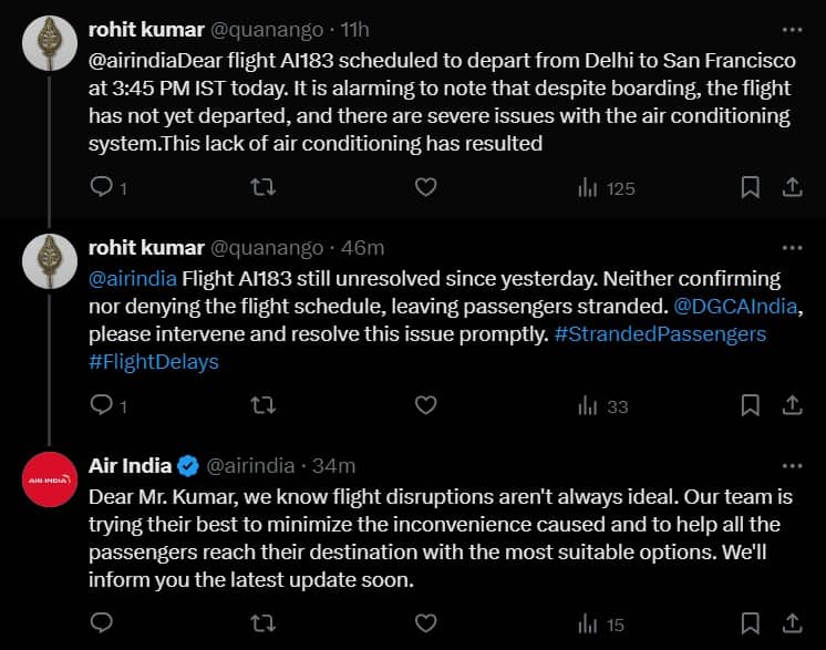 Responding to her tweet, Air India said, "Dear Ms. Punj, we truly regret to note the disruptions. Please be rest assured that our team is actively working to address the delay and appreciate your ongoing support and understanding. We are also alerting our team to provide necessary assistance to the passengers."