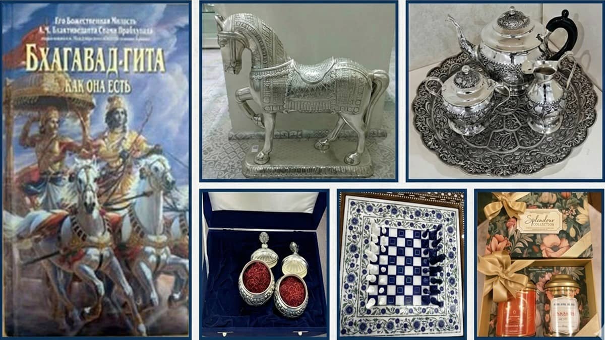 PM Modi gifts Russian President Putin India's cultural offerings, including Assam tea, a silver tea set, a horse figurine, marble chess, Kashmiri saffron and a Russian‑translated Bhagavad Gita.