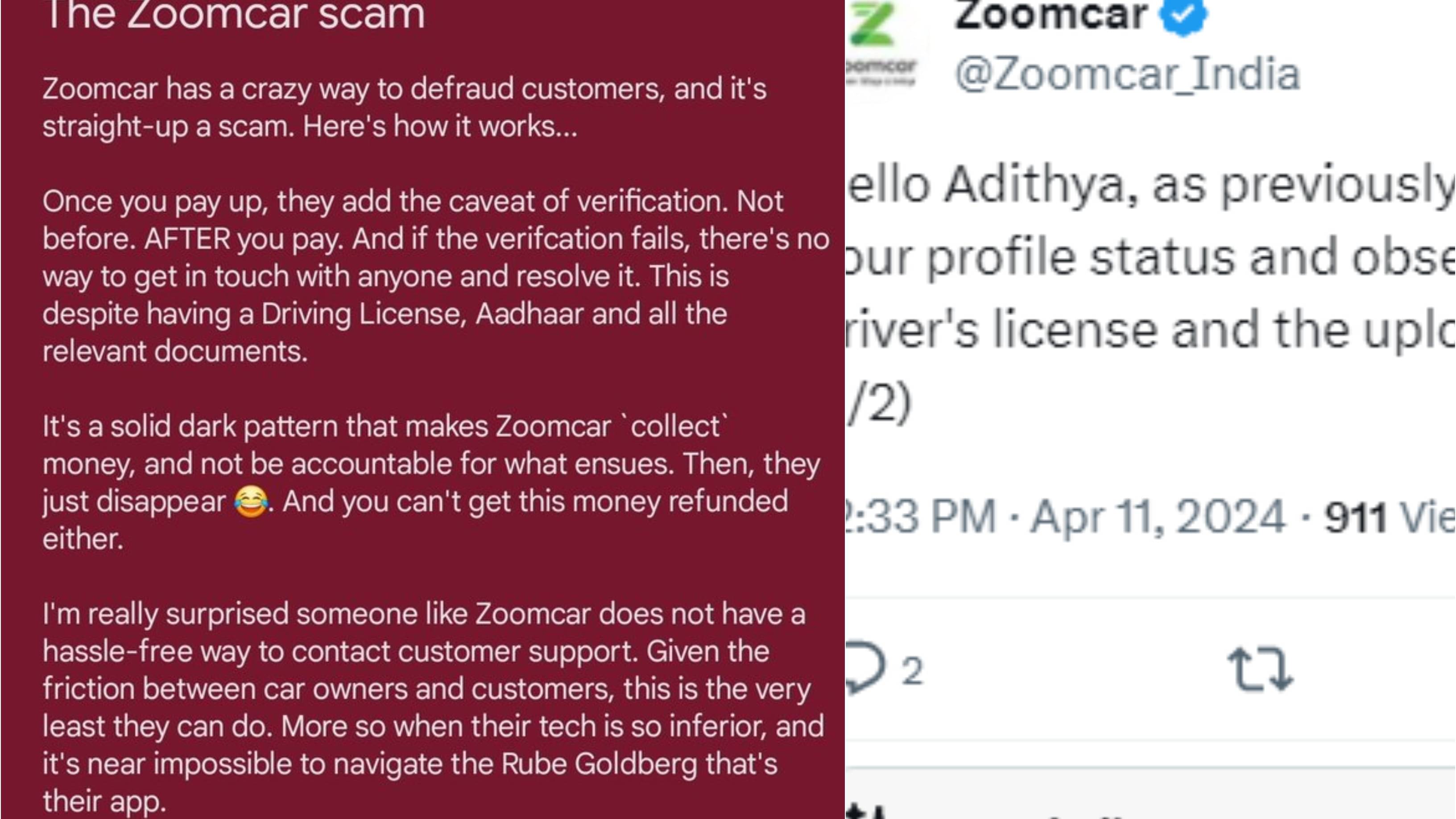 Adithya Venkatesan took to social media platform X sharing his recent experience with the car rental company. Post that is now getting viral comes with a caption, ‘The scam that's @Zoomcar_India’