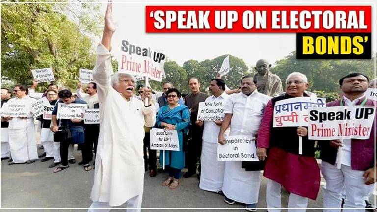 On Friday, November 22, the Congress gave a Suspension of Business Notice in Rajya Sabha under rule 267, over "reservation expressed by RBI (Reserve Bank of India) and ECI (Election Commission of India) on Electoral Bonds Scheme." After this Congress leaders like Manish Tiwari, Shashi Tharoor, Ghulam Nabi Azad, Adhir Ranjan Chowdhury, Karti Chidamabrarm among others stood outside to protest. They held placards reading, "New name of corruption is electoral bonds, speak up Prime Minister, Rs 6,000 crore for BJP? Ambani or Adani, transparency in electoral bond."