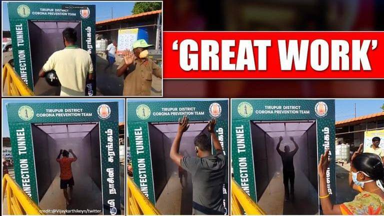 A unique disinfection tunnel was set up for the first time in India, near Thennampalayam market, in Tiruppur, Tamil Nadu. The tunnel requires people to walk through it with their arms raised for a few seconds after washing their hands. The people are further sanitised and disinfected by a disinfectant solution sprayed on them, which is capable of killing the virus. The tunnel was inaugurated by K. Vijayakarthikeyan, Tiruppur's District Collector, who also took to Twitter to share videos of the innovative tunnel.