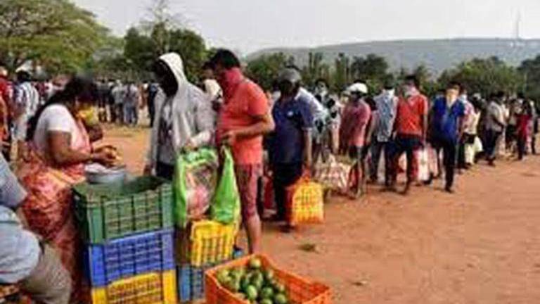 Odishas biggest vegetable market at Unit-I in Bhubaneswar has been shifted to a ground of a local high school. The police and other officials across the state, in a bid to ensure social distancing at grocery shops and vegetable markets, asked people to stand inside equidistant circles drawn on the roads and move towards the shops in an orderly manner.