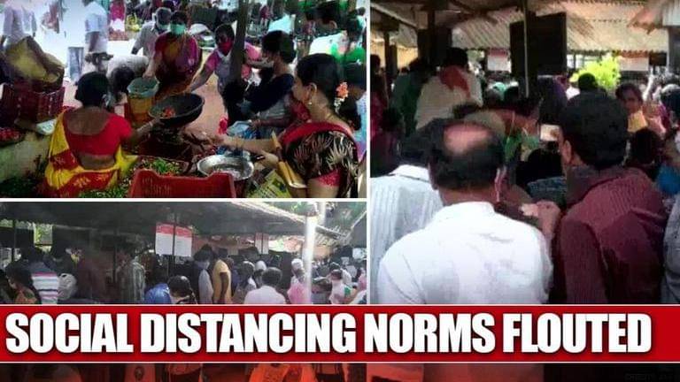 As Tamil Nadu Chief Minister Edappadi Palaniswami announced a 'complete lockdown' in the state from April 26 to April 29 between 6 am and 9 pm, people have thronged the markets to buy essentials flouting the social distancing norms on Saturday. A large number of people were seen gathered at B.B Kulam farmers market in Madhurai and at the Koyambedu vegetable market in Chennai to buy essentials.