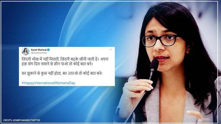On the Occasion of the International Women's day, Delhi Women's Commission Chairperson Swati Maliwal on Sunday tweeted a quatrain. Maliwal's lines highlighted the fighting spirit of women to take on what is one's right. The tweet if translated means ''Life is not given in charity, one has to step forward to snatch it, it would be nice if you can snatch your rights from a hard-hearted society. Nothing will happen by bowing your head, things will change if you hold your head high''.